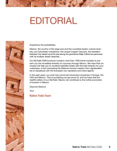 Native Trails MyTrails 2026 3 Aguascalientes Experience the possibilities, Mexico, the country of the large soul and the countless facets; cultural diversity, pre-Columbian civilizations, the unique Copper Canyons, the transition between the desert and the sea along the grandiose Baja California peninsula with its endless dream beaches ... Our MyTrails 2026 brochure contains more than 1000 travel modules to present you the incredible diversity of a journey through Mexico. We hope that our manual will help you to combine beautiful hotels with the best itinerary for your customers; a tool connecting the Mexican tourism industry from Aguascalientes to Zacatecas with the European tour operators and travel agents. In the past years, our work has convinced renowned companies in Europe, the USA and Mexico. That is something we are proud of, and we hope that the twelfth edition of our MyTrails‘ Mexico will contribute to the further promotion of tourism in Mexico. Discover Mexico! Your Native Trails Team EDITORIAL